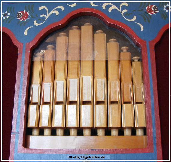 Um den technisch Interessierten (und den "Zweiflern", die einen MP3-, CD- oder Cassettenspieler im Inneren vermuten) das reale Innenleben der Orgel (Schläuche, Balg, große Pfeifen usw.) zeigen zu können, habe ich den normalerweise fest verschraubten Gehäusedeckel so umgebaut, dass man ihn leicht öffnen und hochklappen kann.