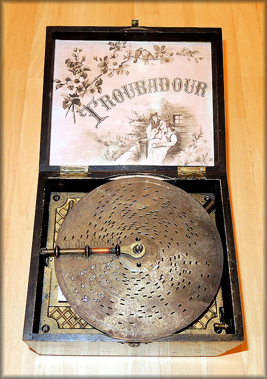 So fand ich auch irgendwann diese kleine Platten-Spieldose der Marke "Troubadour" für 18-cm-Lochblechplatten.